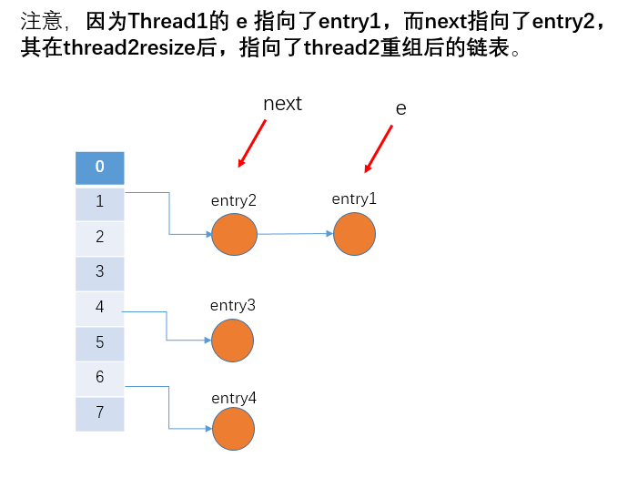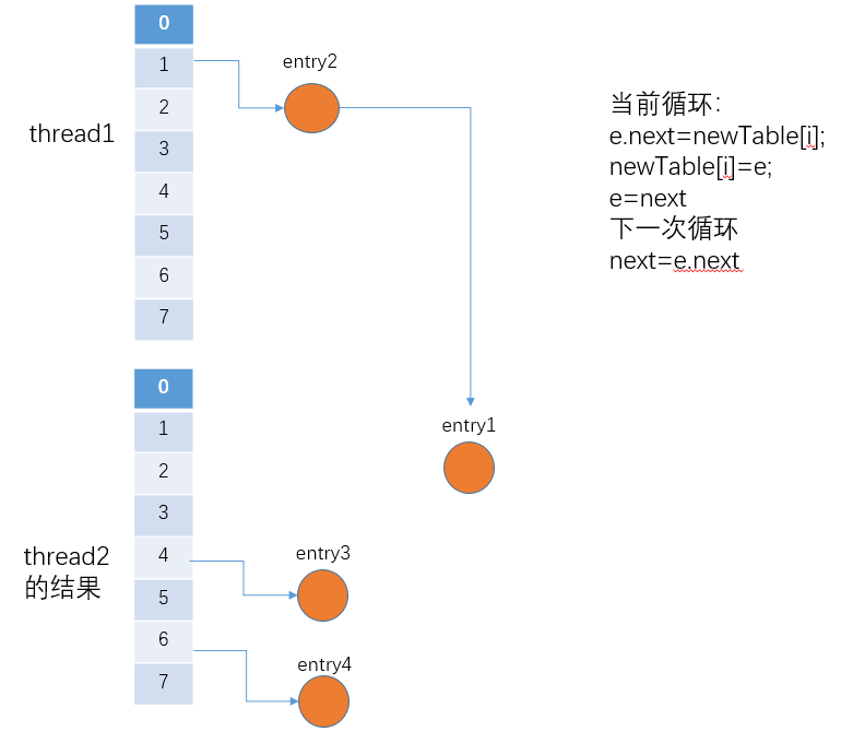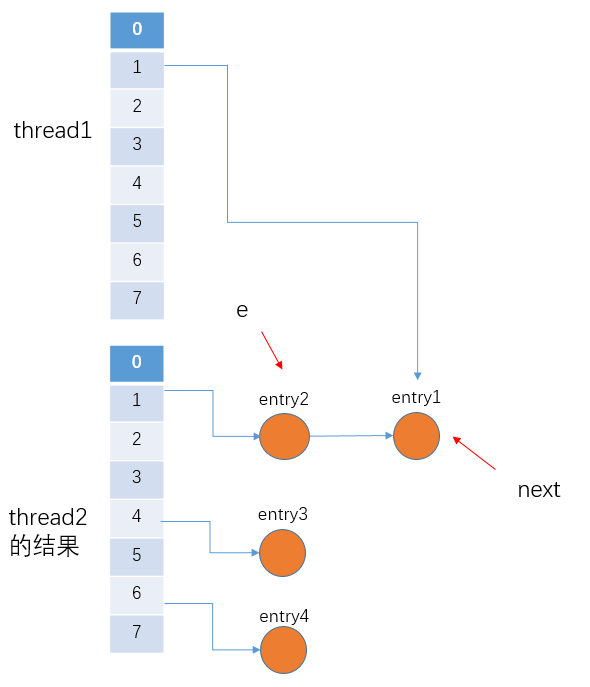 - 而下一次循环的next = e.next,(即next=entry2.next=entry1这是thread2执行的结果)导致了next指向了entry1