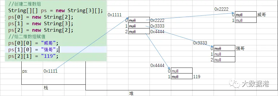 二维数组的元素是一维数组 String [][] persons; String persons2[][]; String [] persons3[]; persons = new String[][]{{"小龙哥","110"},{"小仓","119"},{"小强","120"}}; //声明和初始化不能分开 int[][] numbers = {{1,2},{3,4},{5,6}}; persons2 = new String[3][2]; //3值得是二维数组长度,2指的是二维数组元素(一维数组)的长度 //创建一个长度为3的二维数组,二维数组的元素为null persons3 = new String[3][]; persons3[0] = new String[2]; persons3[1] = new String[3]; String aString = persons3[2][2]; int a = persons3.length; int b = persons3[0].length;