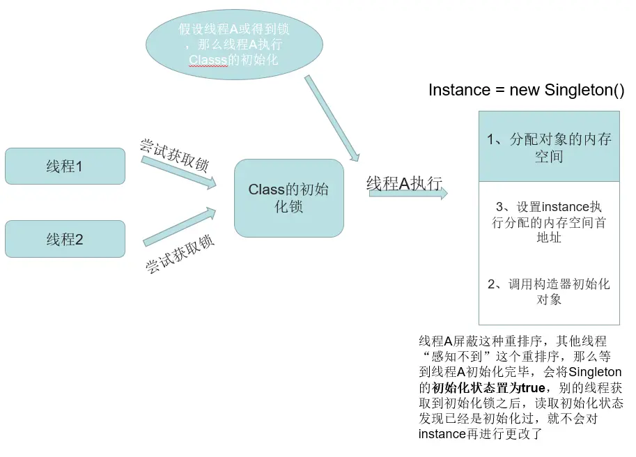 在《深入理解Java虚拟机》的虚拟机类加载机制哪一章中我们知道类加载大致分为加载、链接(验证、准备、解析)、初始化这几个阶段,而上面这种方式的实现主要就是利用初始化阶段的一些规则来保证的。