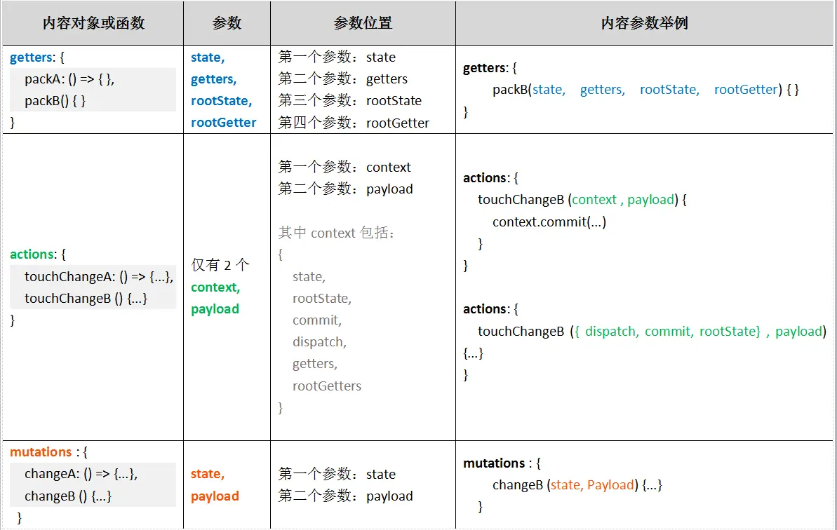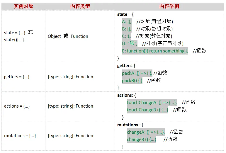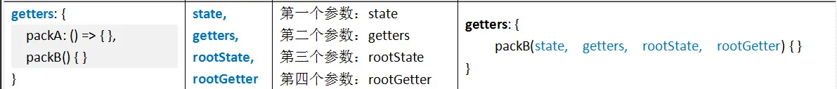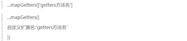 | getters | 包含多个getter计算属性函数的对象 | mapGetters() | getters = {...} |
