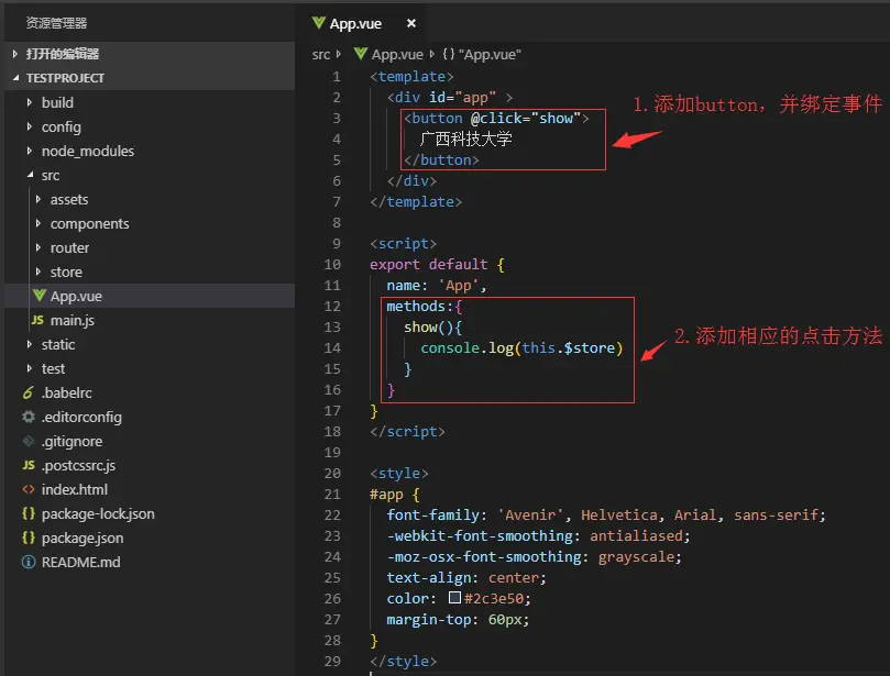 在App.vue组件中,引入外部js后,在按钮绑定方法里调用外部js的方法