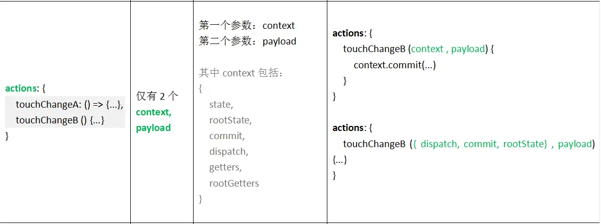 | actions | 包含多个对应事件回调函数的对象 | mapActions() | actions = {...} |