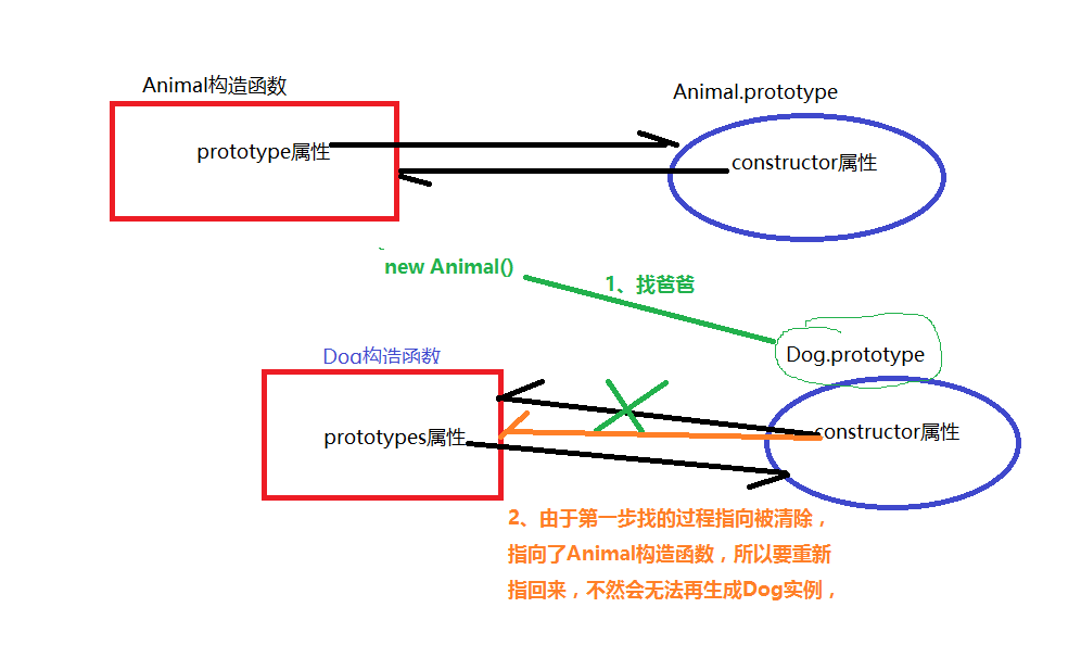 原来,任何一个prototype对象都有一个constructor属性,指向它的构造函数。如果没有Dog.prototype = new Animal();这一行,Dog.prototype.constructor是指向 Dog的;加了这一行以后,Dog.prototype.constructor指向Animal。