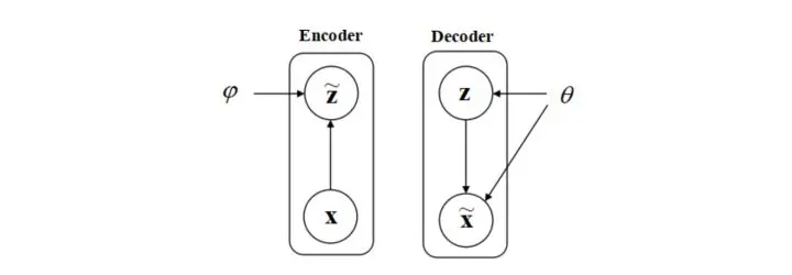 图 1 VAE的架构。编码器(Encoder)是推断模型,解码器(Decoder)是生成模型。箭头表示参数或者数据的输入输出。