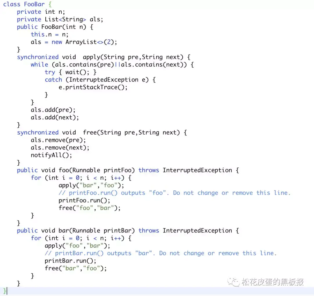 The same instance of FooBar will be passed to two different threads. Thread A will call foo()while thread B will call bar(). Modify the given program to output "foobar" n times.