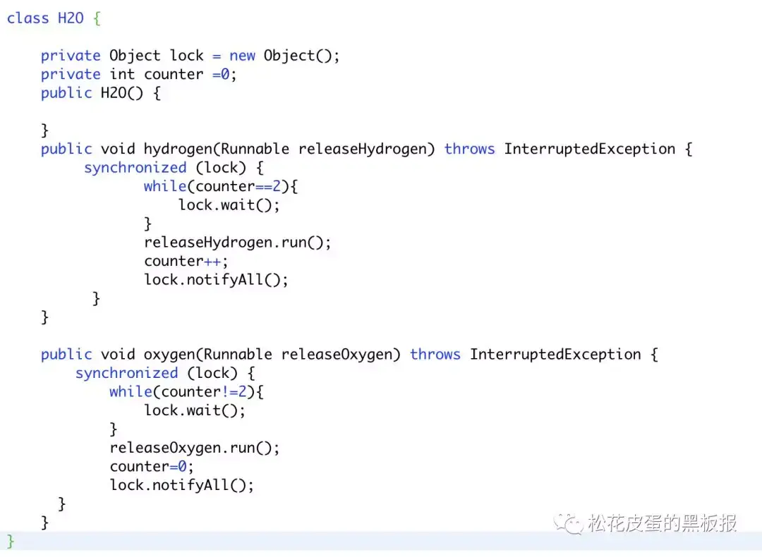 There are two kinds of threads, oxygen and hydrogen. Your goal is to group these threads to form water molecules. There is a barrier where each thread has to wait until a complete molecule can be formed. Hydrogen and oxygen threads will be given a releaseHydrogen and releaseOxygen method respectfully, which will allow them to pass the barrier. These threads should pass the barrier in groups of three, and they must be able to immediately bond with each other to form a water molecule. You must guarantee that all the threads from one molecule bond before any other threads from the next molecule do.