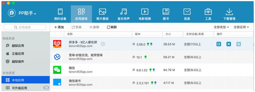 电脑安装一个 pp助手客户端,直接下载越狱应用,下载完成后,即可在“本地应用”中找打 APP 的 ipa 包。需要强调一点,这种方式下载的应用是解密后的 ipa。