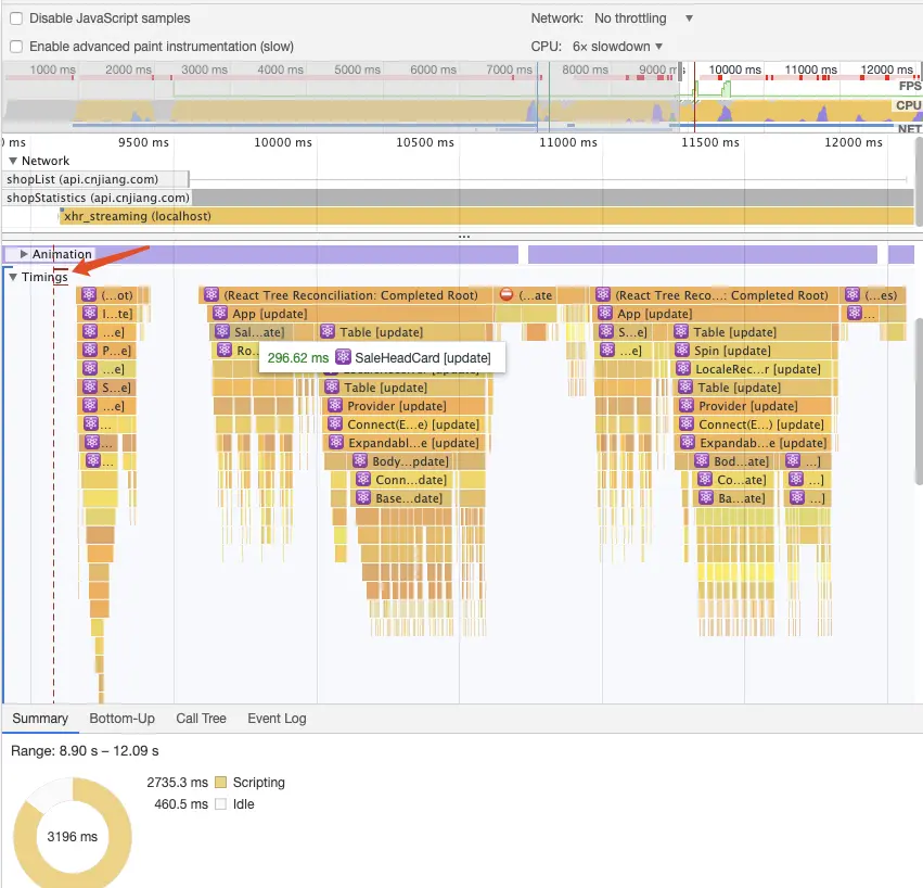虽然知道总体性能,但是没有更详细的组件渲染周期,你不知道有哪些组件被多次重渲染,占用主线程过长,是否存在性能。这时候,你可以点击上图左侧的Timings。