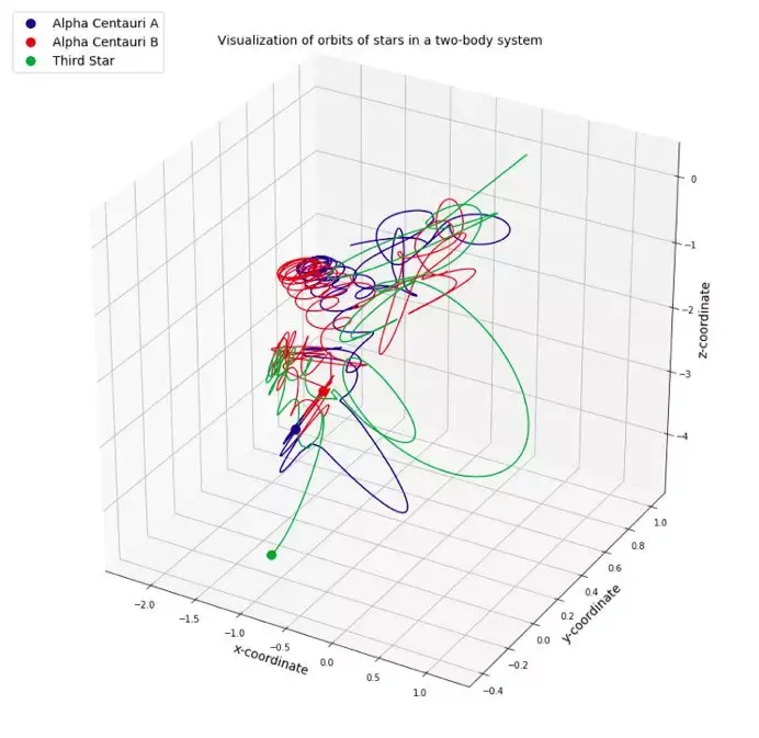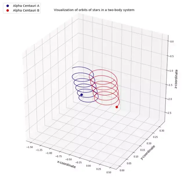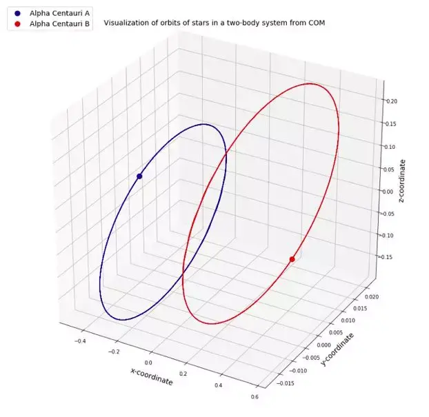 #Find location of Alpha Centauri B w.r.t COMr2com_sol=r2_sol-rcom_sol最后,可以使用更改变量后的绘制之前图像使用的代码,绘制以下图像。