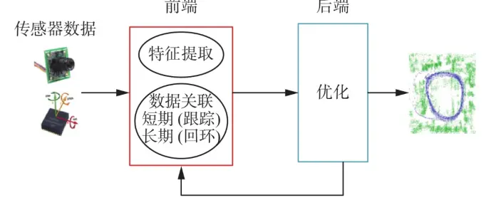 目前主流的视觉惯导融合框架分为两部分:前端和后端。前端提取传感器数据构建模型用于状态估计,后端根据前端提供的数据进行优化,最后输出相机的位置、姿态和全局地图,架构如图所示: