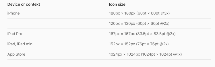 先了解官方建议图标尺寸。当然其他尺寸,App图标也会接受,自动适应。