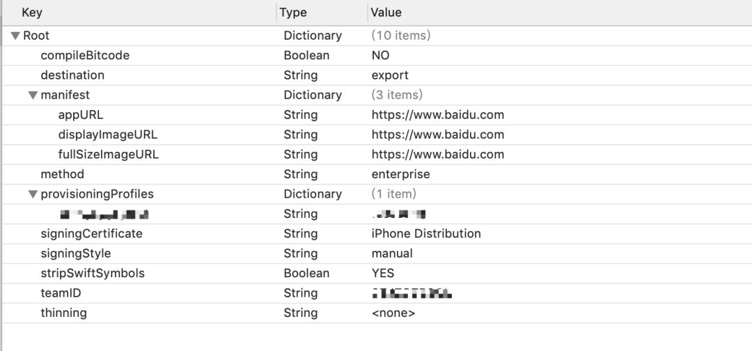 ExportOptions.plist文件中有以下字段,配置如下:method:字符串,为打包的类型,分为app-store,ad-hoc,enterprise和development,根据自己实际打包情况填写。provisioningProfiles:字典,Xcode9需要,键值对为{bundleid:描述文件名},描述文件名最好使用其对应的UUID。signingCertificate:证书类型,开发环境为iPhone Developer,生产环境为iPhone Distribution。signingStyle:自动还是手动(manual与automatic),填写manual即可。stripSwiftSymbols:填写为YES。teamID:为开团队ID,在钥匙串中点击证书详情可以查看到。uploadBitcode:为YES即可。uploadSymbols:为YES即可。