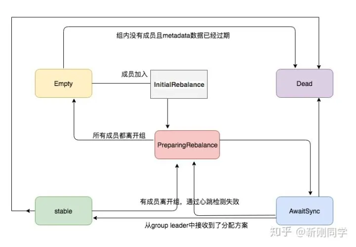 - Empty:初始状态,Group 没有任何成员,如果所有的 offsets 都过期的话就会变成 Dead