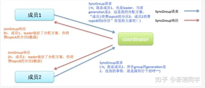 比如心跳线程在timeout时间内没和broker发送心跳,此时coordnator认为该group应该进行reblance。接下来其他consumer发来fetch请求后,coordnator将回复他们进行reblance通知。当consumer成员收到请求后,只有leader会根据分配策略进行分配,然后把各自的分配结果返回给coordnator。这个时候只有consumer leader返回的是实质数据,其他返回的都为空。收到分配方法后,consumer将会把分配策略同步给各consumer