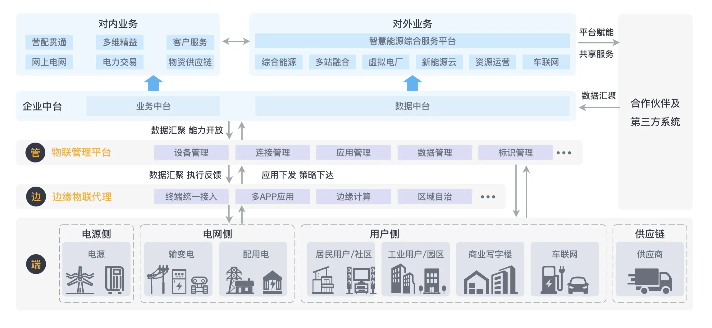 智慧物联体系建设重点包括物联管理平台、边缘物联代理以及各类型终端的标准化接入。通过智慧物联体系建设,实现“边端分离、边管共用”。 从功能需求角度分析,电力物联管理平台需要能够提供云-边结合的统一平台服务,包括统一的连接管理、设备管理、数据管理、应用管理、标识管理等服务,使互联设备可以方便、安全地与业务应用及其他设备交互。同时由于电力设备数量庞大,平台需要具有支持百万级设备接入、亿级消息处理并将其安全可靠地转发至企业中台和业务系统的能力。