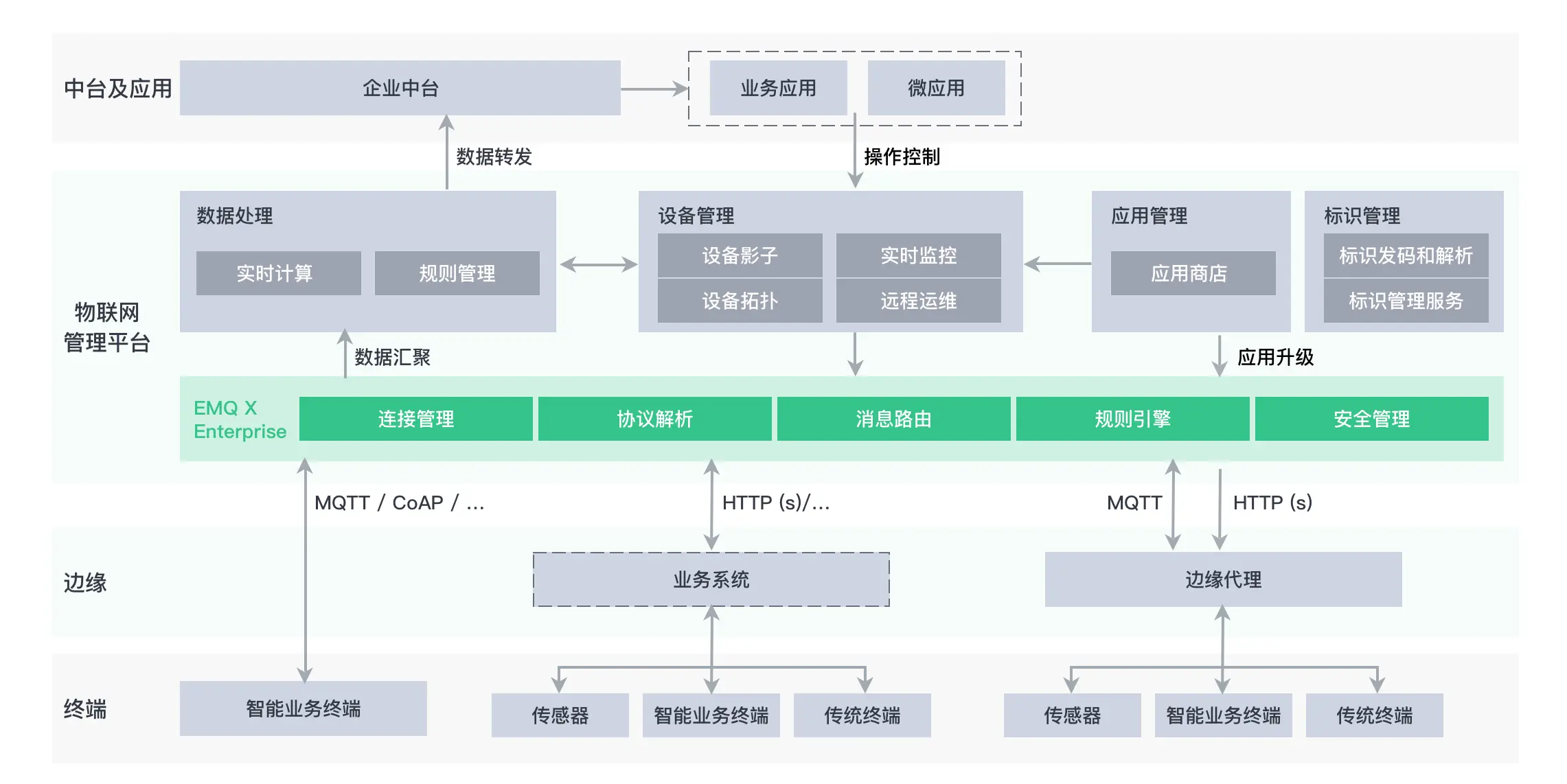 EMQ X Enterprise作为电力物联网系统中物联网管理平台设备接入与数据处理的核心模块,能够基于任意网络(电力专网、运营商网络、卫星网络)接入任意协议的电力设备,实现电力各类终端设备的即插即用,为各类企业数据与业务中台提供设备接入、数据存储、数据共享与数据清洗能力。