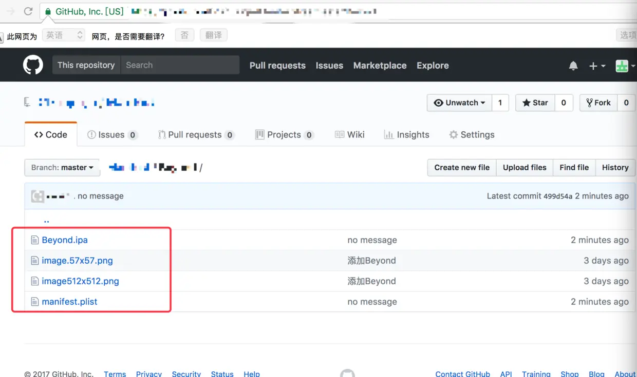 .ipa文件,可以是企业级签名,也可以是dev签名包 manifest.plist文件,plist文件和ipa文件必须放在支持https://服务器上,而且必须是公网ssl,自签名及免费的https不可用(本文以GitHub为例)- 下载应用的