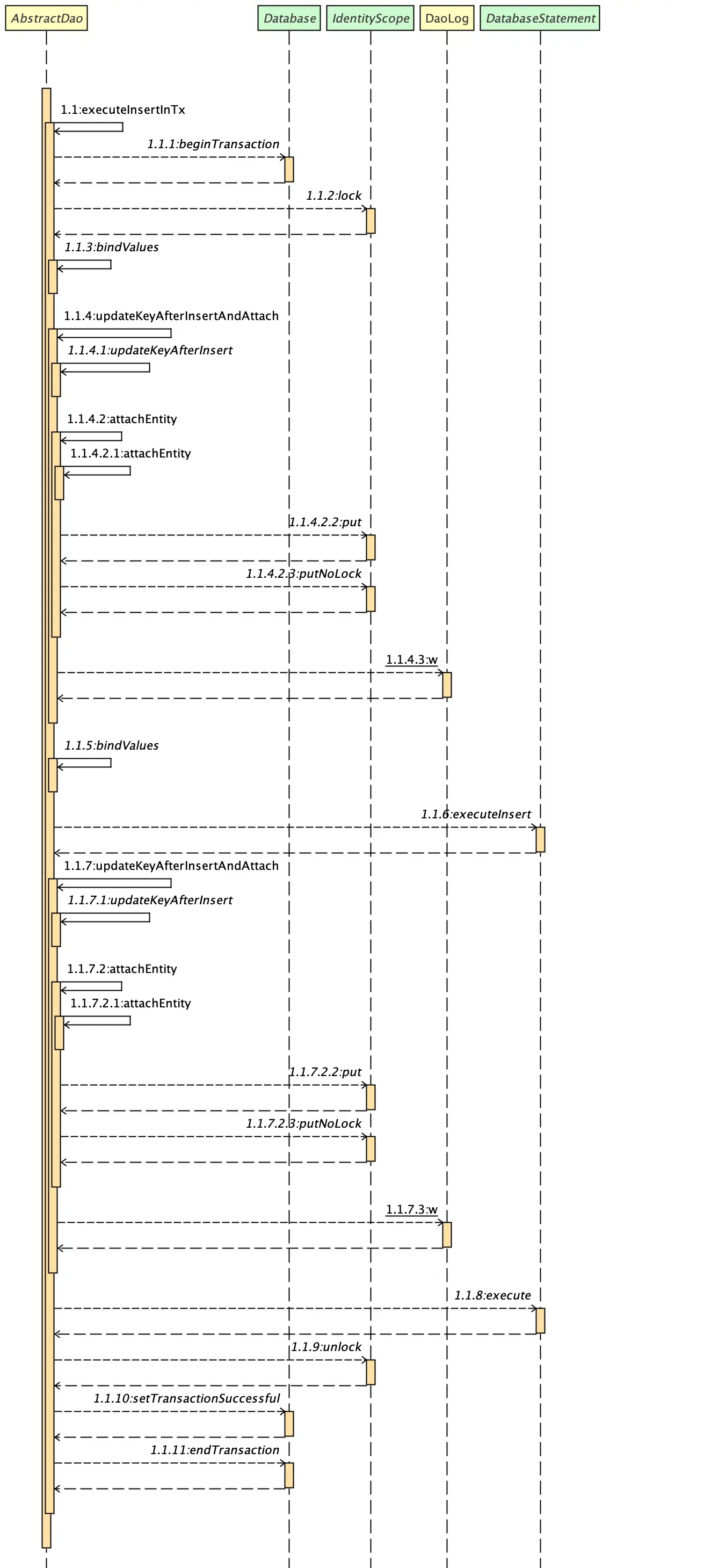 identityScope或identityScopeLong不为空,开启缓存。先尝试从缓存中读取数据,如果缓存数据不为空,则直接返回数据;如果缓存数据为空,那么读取数据库,将数据库中读取到的数据保存到缓存中,并返回该数据。 identityScope或identityScopeLong为空,不开启缓存。直接读取数据库,并返回数据库中读取到的数据。 3.缓存的使用 在以上增删查改等持久化方法的分析中,我们已夹带着分析了缓存的操作,此处不再赘述了。 性能 greenDAO性能之所以好,必有其原因,我们就从以下几点进行说明: 1.编译期生成类 不像其他框架通过运行期反射来创建ORM映射,greenDAO而是在编译期就帮忙生成了绝大部分类文件,从而提升了运行期的速度。 2.直接操作底层类 从以上增删查改等持久化方法的分析中,我们发现,greenDAO直接调用了SQLiteStatement,而没有调用SQLite开放给我们的API,如 insert(String table, String nullColumnHack, ContentValues values)