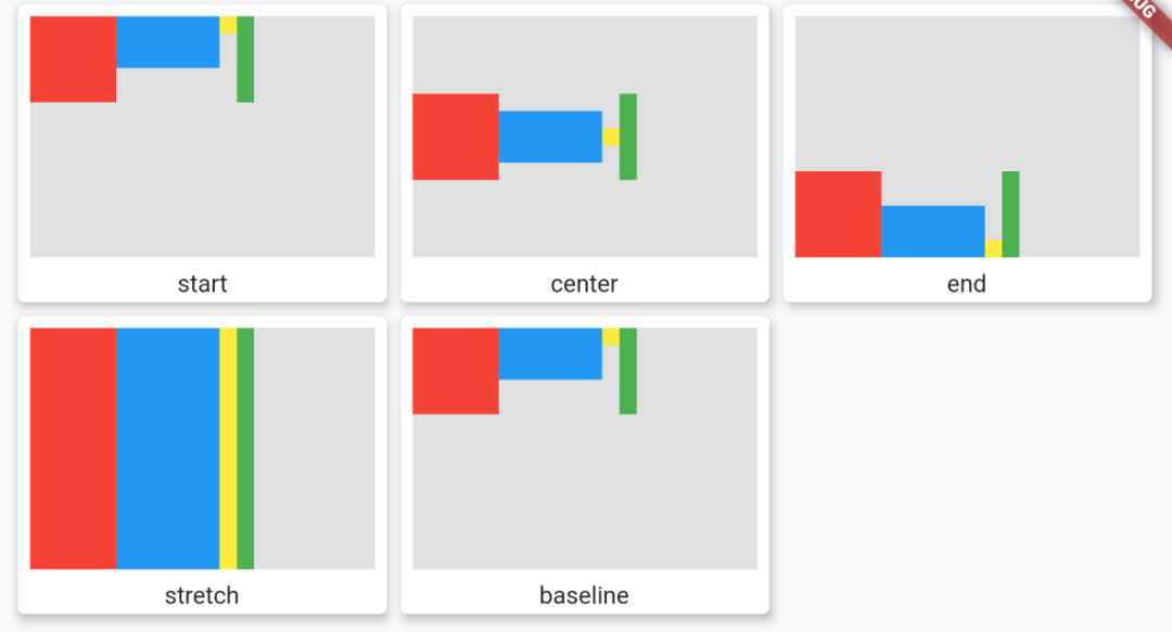 1testCrossAxisAlignment(){ 2 var redBox= Container( 3 color: Colors.red, 4 height: 50, 5 width: 50, 6 ); 7 8 var blueBox= Container( 9 color: Colors.blue,10 height: 30,11 width: 60,12 );1314 var yellowBox= Container(15 color: Colors.yellow,16 height: 10,17 width: 10,18 );1920 var greenBox= Container(21 color: Colors.green,22 height: 50,23 width: 10,24 );2526 var crossAxisAlignment =[CrossAxisAlignment.start,CrossAxisAlignment.center,27 CrossAxisAlignment.end,CrossAxisAlignment.stretch,CrossAxisAlignment.baseline];2829 var show = MultiShower(crossAxisAlignment,(e){30 return Flex(31 direction: Axis.horizontal,32 crossAxisAlignment: e,33 textBaseline: TextBaseline.alphabetic,//基线类型34 children: <Widget>[redBox,blueBox,yellowBox,greenBox],3536 );37 },color: Colors.black12,width: 200,height: 140);3839 return show;40}