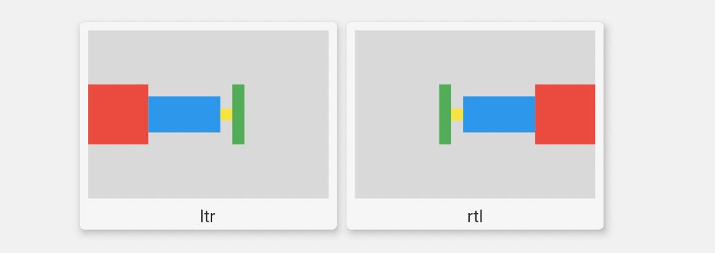 1testTextDirection(){ 2 var redBox= Container( 3 color: Colors.red, 4 height: 50, 5 width: 50, 6 ); 7 8 var blueBox= Container( 9 color: Colors.blue,10 height: 30,11 width: 60,12 );1314 var yellowBox= Container(15 color: Colors.yellow,16 height: 10,17 width: 10,18 );1920 var greenBox= Container(21 color: Colors.green,22 height: 50,23 width: 10,24 );2526 var textDirection =[TextDirection.ltr,TextDirection.rtl];27 var show = MultiShower(textDirection,(e){28 return Flex(29 direction: Axis.horizontal,30 textDirection: e,31 children: <Widget>[redBox,blueBox,yellowBox,greenBox],3233 );34 },color: Colors.black12,width: 200,height: 140);35 return show;36}