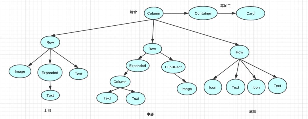 1由上中下三行,可以用Column2第一行由图标,文字和文字组成,其中两头分处左右,可以用Expanded处理 3中间比较复杂由一个Row中包含两部分,左边是一个两行Column的内容,右边是文字 4底部是一个Row,主轴对齐是start