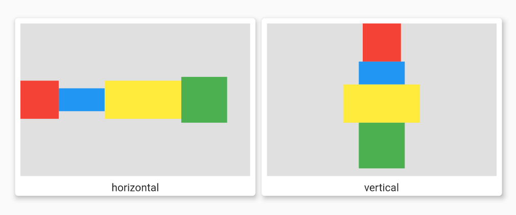 1var direction =[Axis.horizontal,Axis.vertical]; 2var show = MultiShower(direction,(e){ 3 return Flex( 4 direction: e, 5 children: <Widget>[redBox,blueBox,yellowBox,greenBox], 6 7 ); 8},color: Colors.black12,width: 300,height: 200); 910var redBox= Container(11 color: Colors.red,12 height: 50,13 width: 50,14);1516var blueBox= Container(17 color: Colors.blue,18 height: 30,19 width: 60,20);2122var yellowBox= Container(23 color: Colors.yellow,24 height: 50,25 width: 100,26);2728var greenBox= Container(29 color: Colors.green,30 height: 60,31 width: 60,32);