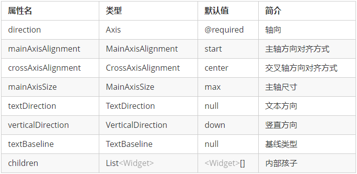 1class Row extends Flex { 2 Row({ 3 Key key, 4 MainAxisAlignment mainAxisAlignment = MainAxisAlignment.start, 5 MainAxisSize mainAxisSize = MainAxisSize.max, 6 CrossAxisAlignment crossAxisAlignment = CrossAxisAlignment.center, 7 TextDirection textDirection, 8 VerticalDirection verticalDirection = VerticalDirection.down, 9 TextBaseline textBaseline,10 List<Widget> children = const <Widget>[],11 }) : super(12 children: children,13 key: key,14 direction: Axis.horizontal, <--------------重点在这15 mainAxisAlignment: mainAxisAlignment,16 mainAxisSize: mainAxisSize,17 crossAxisAlignment: crossAxisAlignment,18 textDirection: textDirection,19 verticalDirection: verticalDirection,20 textBaseline: textBaseline,21 );22}2324Column({25 Key key,26 MainAxisAlignment mainAxisAlignment = MainAxisAlignment.start,27 MainAxisSize mainAxisSize = MainAxisSize.max,28 CrossAxisAlignment crossAxisAlignment = CrossAxisAlignment.center,29 TextDirection textDirection,30 VerticalDirection verticalDirection = VerticalDirection.down,31 TextBaseline textBaseline,32 List<Widget> children = const <Widget>[],33 }) : super(34 children: children,35 key: key,36 direction: Axis.vertical, <--------------重点在这37 mainAxisAlignment: mainAxisAlignment,38 mainAxisSize: mainAxisSize,39 crossAxisAlignment: crossAxisAlignment,40 textDirection: textDirection,41 verticalDirection: verticalDirection,42 textBaseline: textBaseline,43 );44}