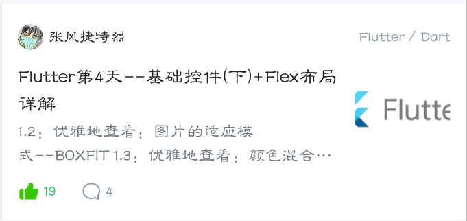 1---->[使用]---- 2ArticlePanel( 3 article: ArticleBean(userName: "张风捷特烈", 4 title: "[Flutter必备]-Flex布局完全解读", 5 info: "也就是水平排放还是竖直排放,可以看出默认情况下都是主轴顶头," 6 "交叉轴居中比如horizontal下主轴为水平轴,交叉轴则为竖直。也就是水平顶头,竖直居中" 7 "这里使用MultiShower快速展示,更好的对比出不同之处", 8 type: "Flutter/Dart", 9 starCount: "2000",10 commentCount: "3000",11 userIcon: Image.asset("images/icon_head.png"),12 cover: Image.asset("images/wy_300x200.jpg",fit: BoxFit.cover)13 ),14 );