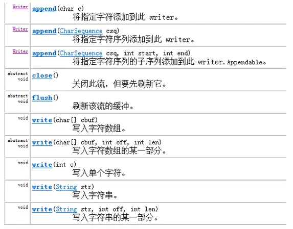 在 Writer 中, 因为字符流直接以字符作为操作单位,所以 Writer 可以用字符串来代替字符数组,即以String对象来作为参数。 包含如下方法: