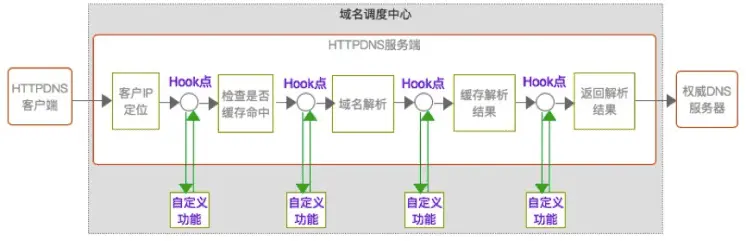 HTTPDNS 通过为以下5个阶段之间提供 Hook 点,并通过引入函数计算在这些 Hook 点实现自定义函数功能。