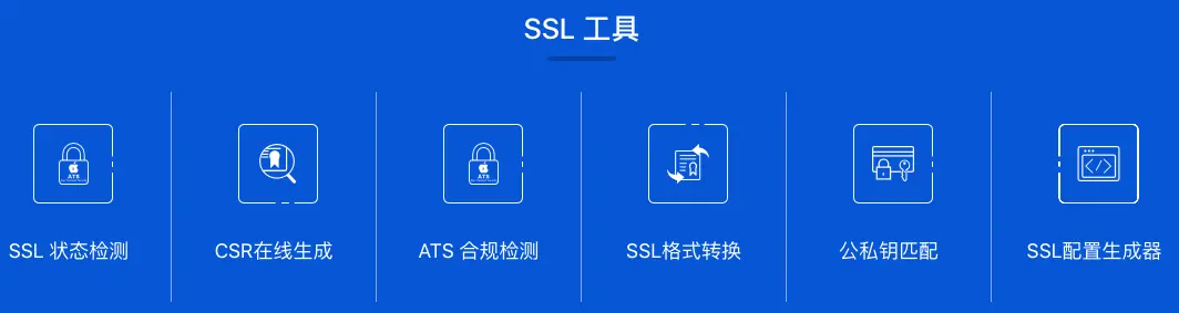 51SSL平台提供多种免费SSL工具:SSL状态检测、CSR在线生成、SSL格式转换、公私钥匹配等。