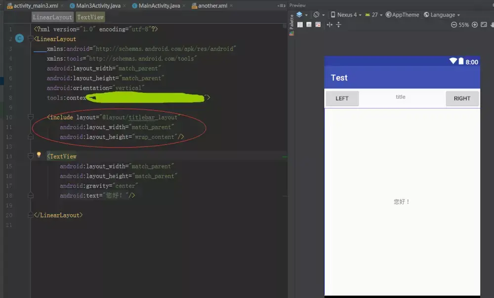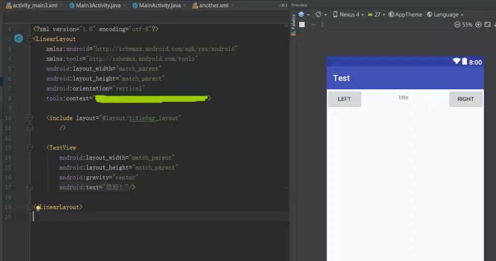 标签当中可以指定一个layout属性,我们在这个layout属性中填写需要引入的布局名就可以了。而且使用这种引入的方式,以后如果titlebar的界面有所变更,我们只需要修改titlebar_layout.xml这一个文件就可以了,而不是所有界面一个个地去修改。到这里不知道你有没有发现问题?仔细看看上方的图片哟!你会发现 布局文件中的 “您好”不见了,并没有在界面中呈现出来,为什么呢?你再往回看看头部文件就知道了。