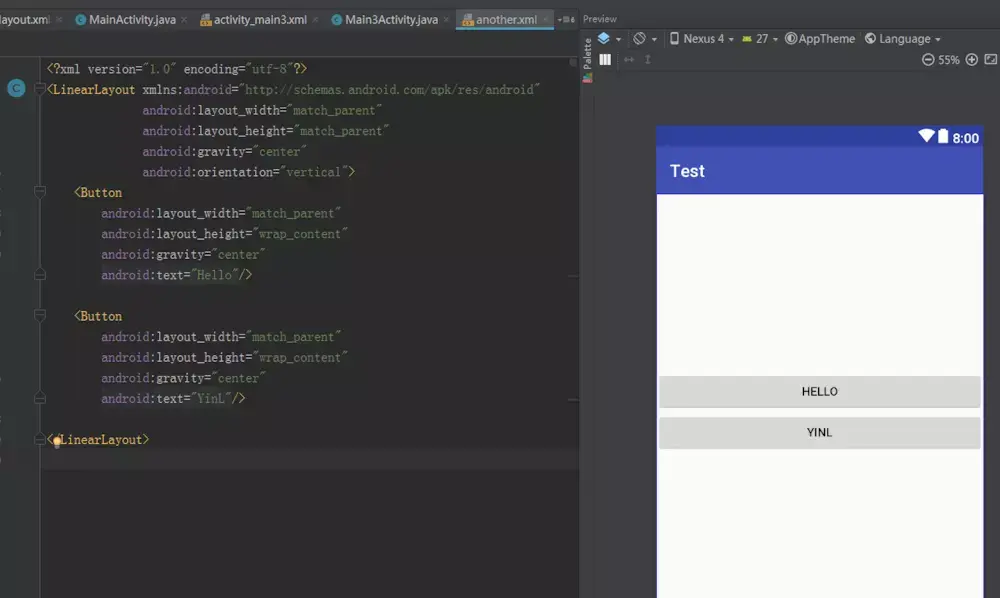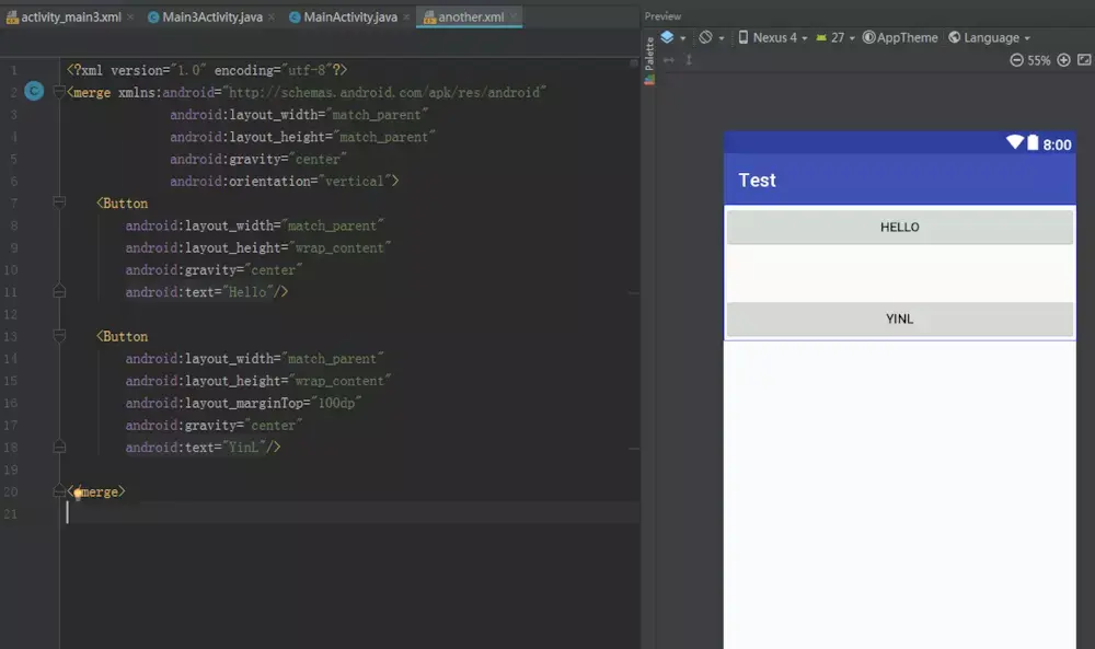 其实,这个内部的LinearLayout就是一个多余的布局嵌套,实际上并不需要这样一层,让两个按钮直接包含在外部的LinearLayout当中就可以了。而这个多余的布局嵌套其实就是由于布局引入所导致的,因为我们在引入的布局文件中也定义了一个LinearLayout。此时使用merge标签来优化,修改another.xml中的代码,如下所示: