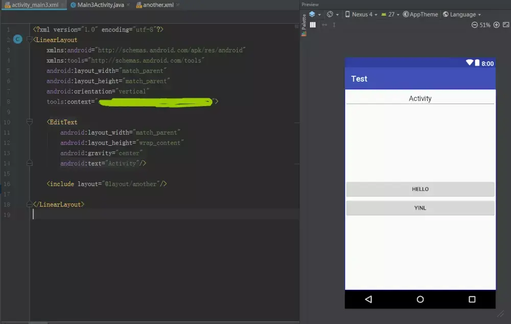 然后将这个布局使用include标签引入到Activity中去。