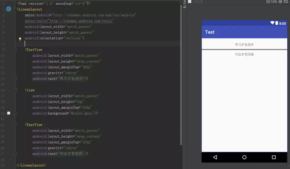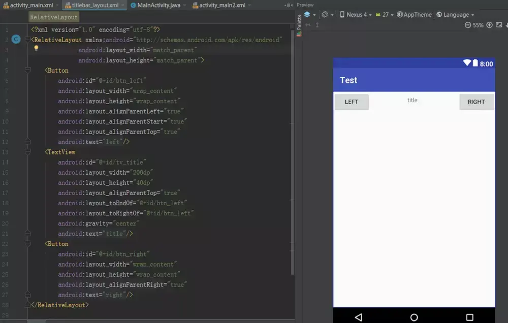 在标签当中,我们是可以覆写所有layout属性的,即include中指定的layout属性将会覆盖掉titlebar_layout中指定的layout属性,可以看到这样修改后,界面显示就正常啦。