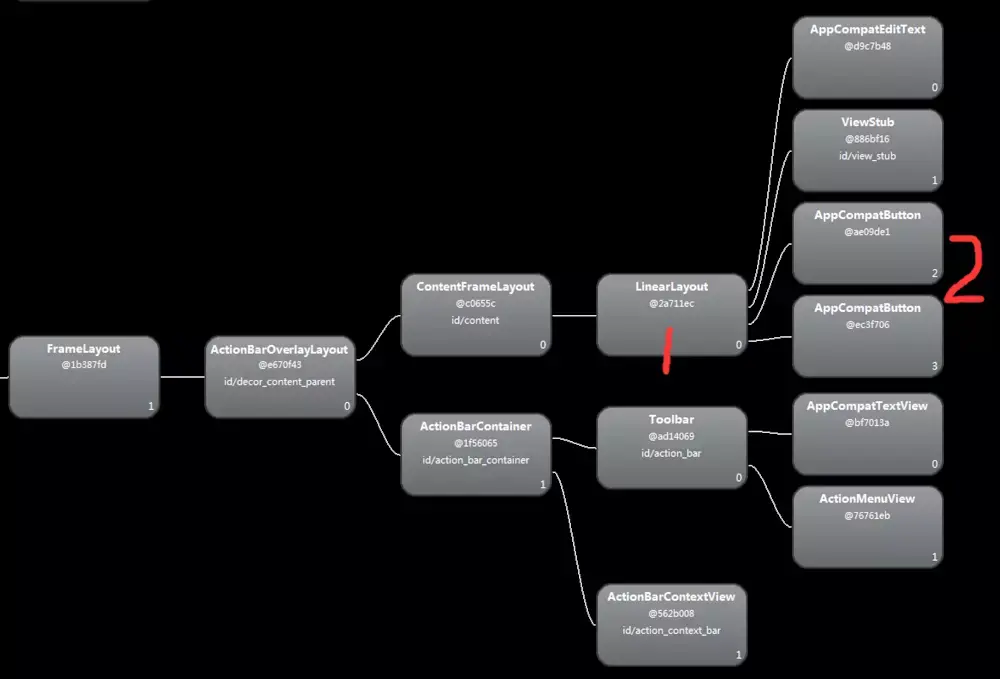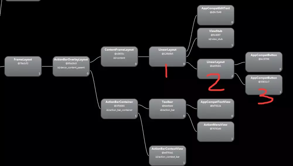 很容易看到,最外层首先是一个FrameLayout,不知道为什么最外层是FrameLayout的朋友可以去查看一下(系统自动添加的)。然后FrameLayout中包含的是一个LinearLayout,这个就是我们最外层的布局(activity_main3.xml)。接下来的部分就有问题了,在最外层的LinearLayout当中包含了两个元素,一个是EditText,另一个又是一个LinearLayout,然后在这个内部的LinearLayout当中才包含了两个按钮。