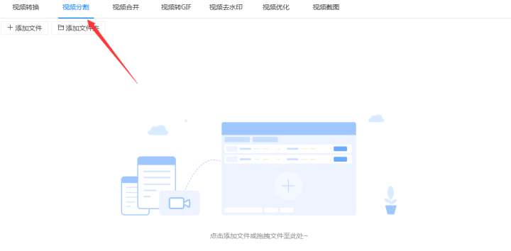 2、选择好“视频分割”功能后把需要分割的视频添加到软件。添加的时候如果文件少可以点击“添加文件”按钮依次把视频添加到软件中,文件多也可以点击“添加文件夹”按钮或用拖拽的方式批量添加文件或文件夹。