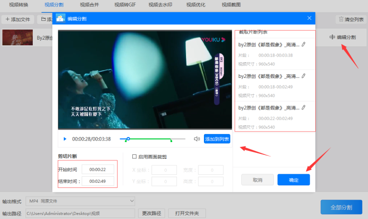 3、添加好视频后可以先点击“编辑分割”按钮,随后会出来一个‘编辑分割’框,此时需要设置好‘开始时间’和‘结束时间’(单个视频可以设置多个区间片段)。然后点击‘添加到列表’再点击‘确定’就设置好分割区间了。