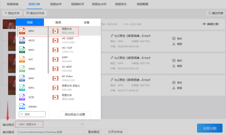 4、设置好‘编辑分割’需要设置好“输出格式”。在设置“输出格式”的时候可以设置输出的视频格式和视频分辨率,由于‘mp4’格式的视频兼容性较高,‘同原文件’分辨率可以保持和原视频相同的分辨率。所以把两项设置设置为软件默认的‘mp4同原文件’格式。