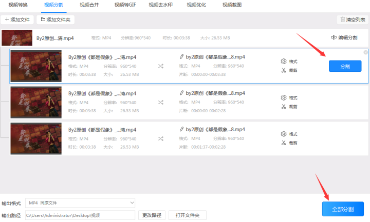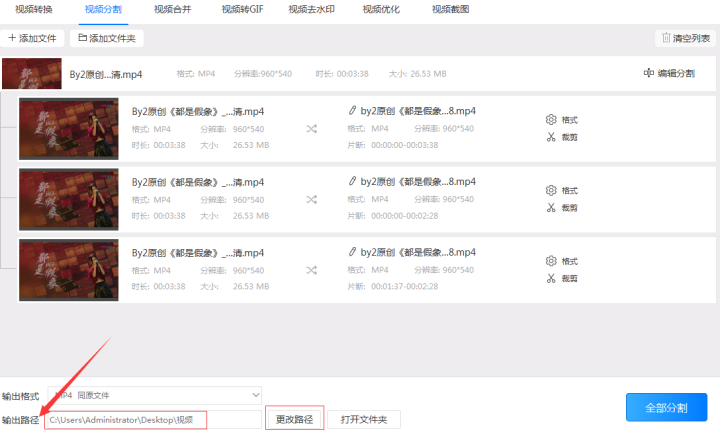 6、以上视频分割的准备工作都完成后就可以点击“分割”/“全部分割”按钮把自己预设好的视频分割区间分割出来了。最后只需要到预设的“输出路径”找到分割后的视频即可。