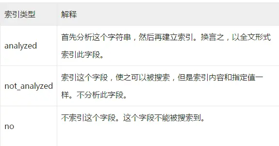 string类型的数据肯定是日常使用得最多的数据类型,下面介绍mapping中string类型字段可以配置的索引类型。