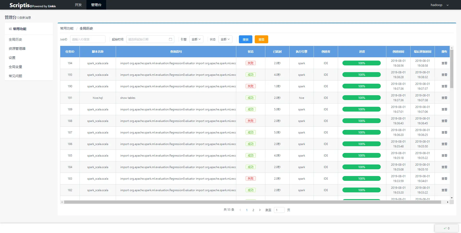 注意到Scriptis主界面的正上方有个管理台的功能,按照官方文档介绍,控制台主要提供Job历史、资源管理和全局变量的功能,方便用户对整个Scriptis的状态控制。控制台在使用Hue时是没有体验到的功能,本着尝鲜的心态点开试了下,清晰的功能界面,颜色分明的Job信息,详细的Job记录,可以说你想要的他居然都有!在全局历史界面还提供细致的搜索操作,避免Job数太多找不到的尴尬情况。