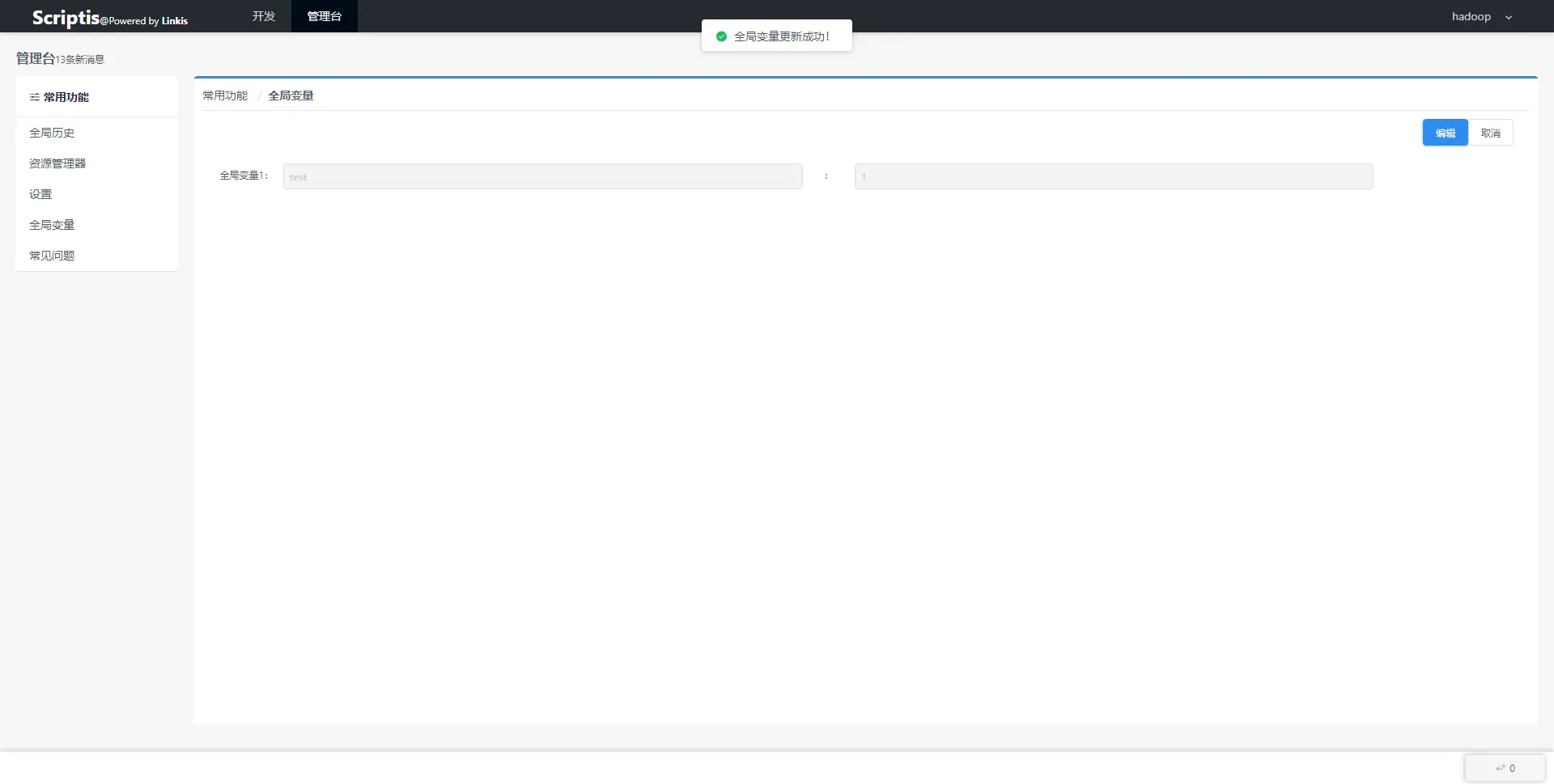 控制台的最后一个功能是提供全局变量的设置,可以方便用户进行复杂的Job开发。