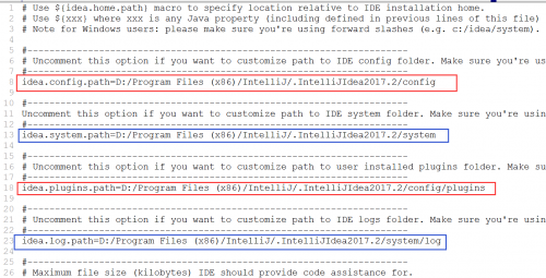 注意,为了不影响使用,先把原来C盘下面的配置文件复制出来(如果你没有启动过idea,那就不需要这一步,自己创建一个新的文件夹就好了),复制到你的非系统盘里,如我默认的idea配置文件是在C:\Users\Administrator\.IntelliJIdea2017.2,将.IntelliJIdea2017.2这个文件复制到了D:\Program Files (x86)\IntelliJ下,进行如下配置: