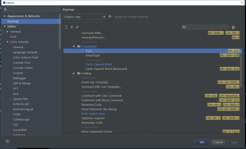 接着在右边的树型框中选择 Main menu –> Code –> Completion. 接着需要做两件事: 1. 移除原来的Cycle Expand Word 的 Alt+/(正斜杠) 快捷键绑定。 2. 在 Basic 上点击右键,去除原来的 Ctrl+空格 绑定,然后添加 Alt + 斜杠 快捷键。