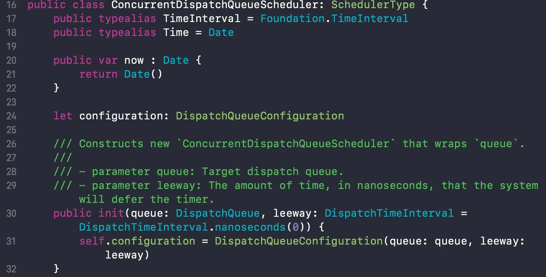 分析以上方法会发现,最终都会调用 self.configuration 的某个方法。而且查看几种调度器的源码可以知道,Scheduler 中都有一个重要的属性 let configuration: DispatchQueueConfiguration。其中保存了我们需要的队列和leeway信息。