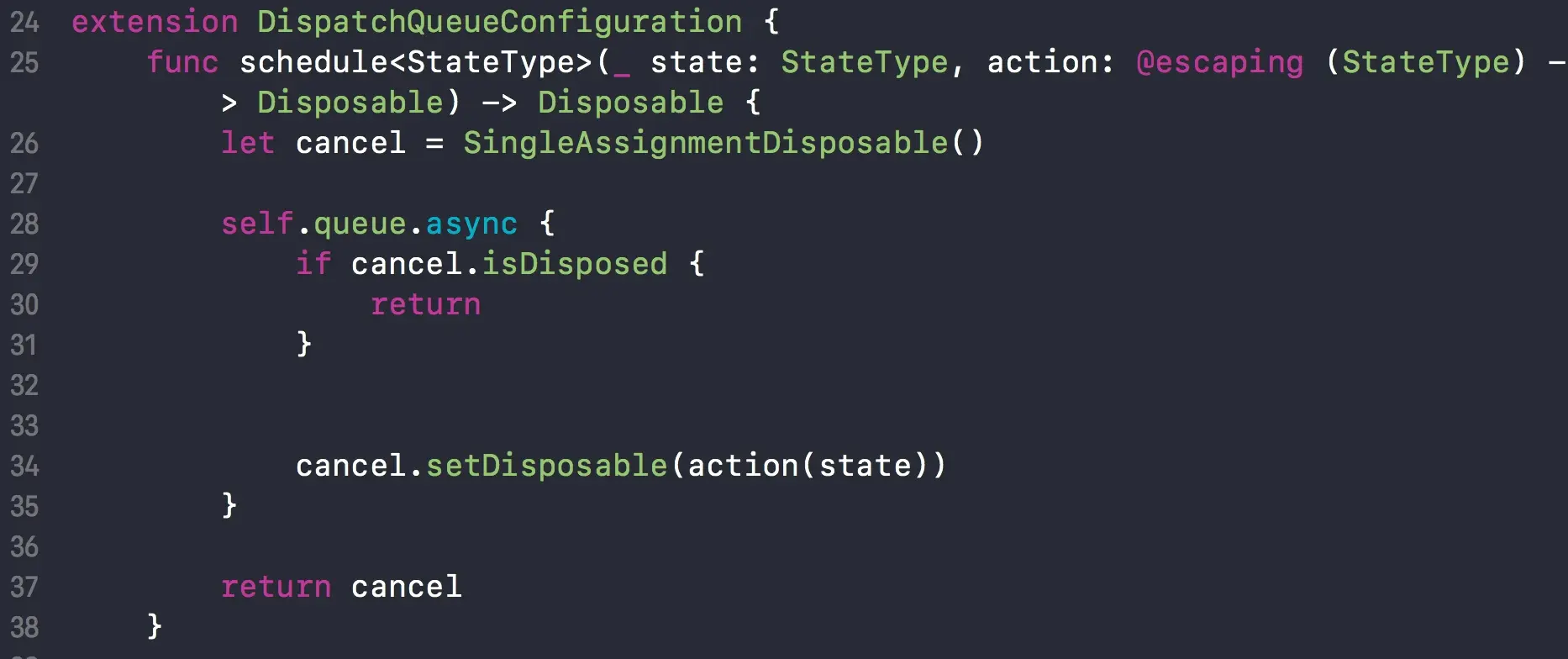 func scheduleInternal<StateType>(_ state: StateType, action: @escaping (StateType) -> Disposable) -> Disposable {