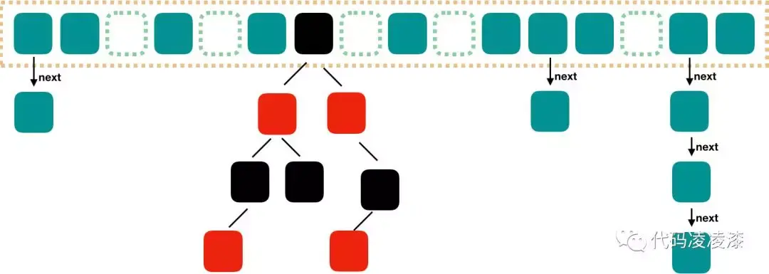 1.8之后,HashMap引入了红黑树。当链表的长度达到阈值之后,链表就会被树化,形成红黑树结构。大致结构图如下: