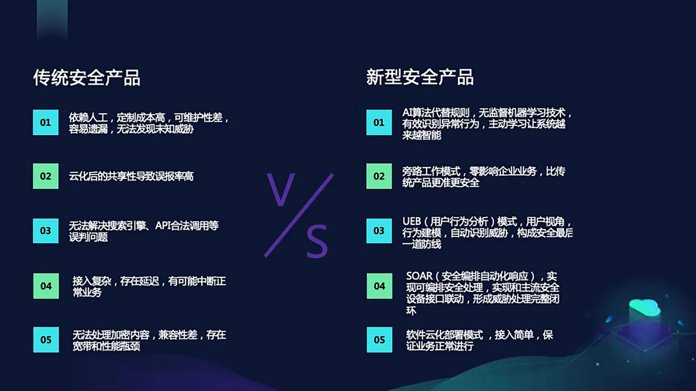 而目前传统的安全产品依赖威胁情报、流量特征、设备指纹等方式进行安全防护,已无法解决上述新问题,因此新型安全产品应运而生。