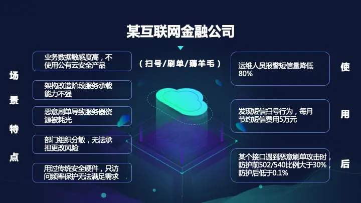 金融类行业主要存在大量刷单、薅羊毛、短信扫号等威胁,这类问题极大消耗服务器资源,导致正常用户无法正常访问,影响企业收益和口碑。